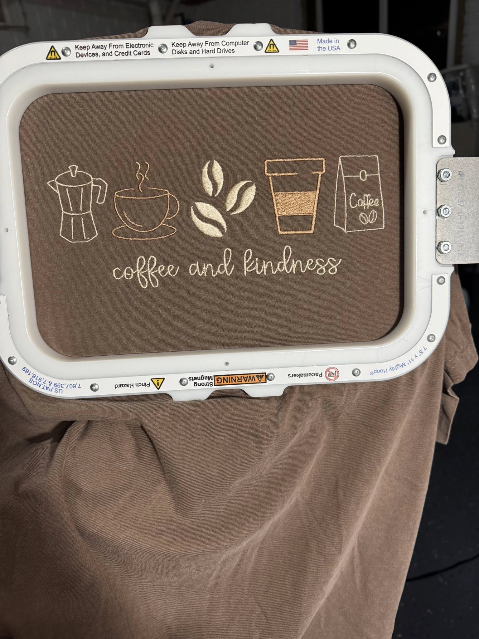 Popular coffee logo embroidered shirt, available in both t-shirt or crewneck. Other colors are available by request.